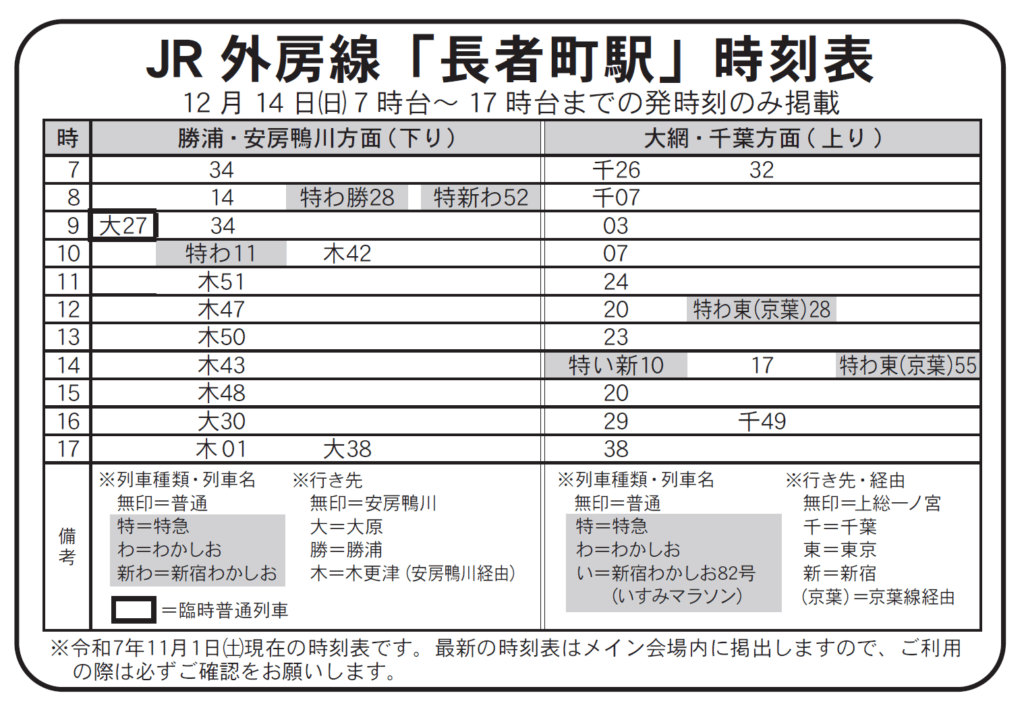 大会当日の7時台〜17時台までの発時刻のみ掲載しています(臨時列車含む)。最新の時刻表はメイン会場内に掲出しますので、ご利用の際は必ずご確認をお願いします。